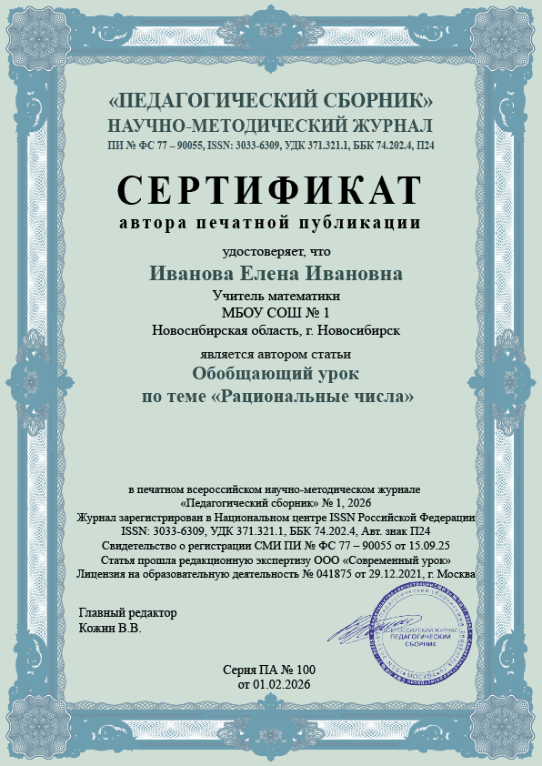 Всероссийский журнал «Педагогический сборник» — рецензируемое печатное СМИ, зарегистрированное в Роскомнадзоре (свидетельство о регистрации СМИ ПИ № ФС 77 - 90055 от 15.09.2025, г. Москва). Журнал имеет международный стандартный серийный номер ISSN 3033-6309, УДК 371.321.1, ББК 74.202.4, авторский знак П24.